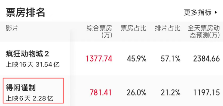 而在此之前备受期待的《得闲谨制》,也难以对它的“称霸”之路,造成什么威胁,上映6天,影片的票房也才2.2亿。